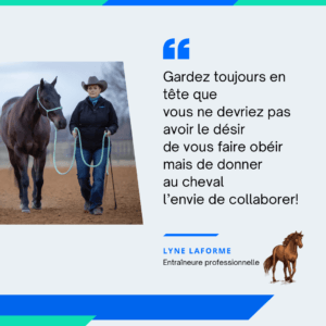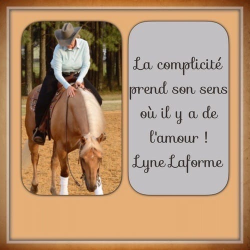 Lyne écrivait dernièrement : ‘’Le vrai partenariat, ce n’est pas le contrôle… c’est la responsabilité partagée. En donnant à votre cheval le choix, vous ouvrez la porte à une réponse volontaire et non contrainte. En l’écoutant, vous développez une communication fine basée sur ses signaux. En lui permettant d’être acteur de ses actions, vous encouragez l’autonomie, la réflexion et l’engagement sincère dans chaque exercice.