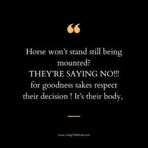 Affiche : Paulette Ribbleton d’Australie dit ‘’le cheval ne veut pas cesser de bouger au montoir. Il dit NON! SVP respectez sa décision, c’est son corps’’.