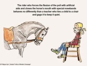 Photo : Le cavalier qui force la flexion avec des aides artificielles et ferme la bouche avec une muserole c’est comme le professeur qui attache l’enfant à la chaise et l’empêche de bouger et de s’exprimer.