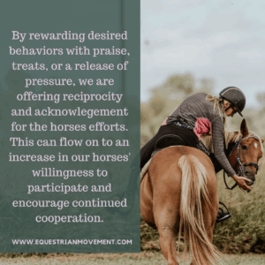 Gabi Neurohr abonde dans le même sens par rapport aux louanges et aux friandises mais nous rappelle que le relâchement de la pression n’est pas une récompense en ce sens que l’on ne donne rien à notre cheval mais on le soulage de la pression et ça l’encourage à bien répondre la prochaine fois car la pression ce n’est pas agréable. Son ‘’bon vouloir’’ risque plus d’être au rendez-vous si le relâchement de la pression est fait selon les règles de l’art.
