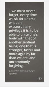 William Steinkraus cavalier olympien le résume bien : ‘’nous ne devons jamais oublier qu’à chaque fois que l’on s’assoit sur un cheval quel privilège extraordinaire c’est de pouvoir unir notre corps avec un être très sensible, un qui est plus fort, plus rapide, fort agile et singulièrement très indulgent’’.
