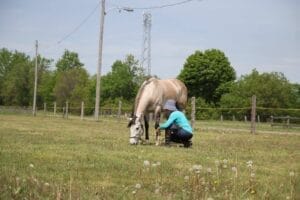 Pour moi le ‘’come’’ est très utile. Quand j’arrive le matin je salue le troupeau et va les caresser et leur dire un beau bonjour. Je passe beaucoup de temps dans le paddock pour ramasser le fumier, nettoyer l’abreuvoir automatique, réparer différentes choses et jouer avec les chevaux. L’été je les arrose au boyau et ils adorent ça. Ce n’est pas toujours le tour à Indy car elle a des congénères. Donc quand je suis prête à faire quelque chose avec Indy j’ai juste à lui dire que je suis prête et le ‘’come’’ l’amène à la porte de la clôture car elle est toujours prête à faire quelque chose.