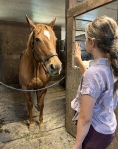 Clémence demande à Diablesse de rester au box car si elle ne lui demande pas la jument passe sous la courroie pour retourner dehors où elle vit à plein temps.