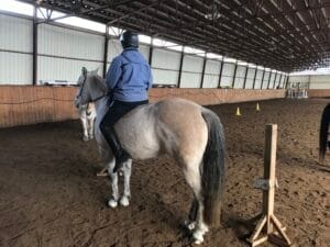 Une fois que nous avons enseigné au sol, rendue en selle je n’ai que le code à utiliser et je n’ai pas besoin de toucher aux rênes et ce même sans bride.