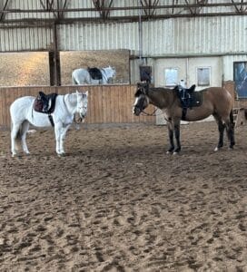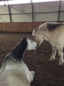 Cortado vient d’apprendre le code ‘’reste’’ ce qu’elle fait régulièrement dans le manège alors que sa propriétaire est proche d’elle. Suite à une heure de jeux en selle avec des cônes et barres au sol que nous avions placés au fond du manège, il nous fallait tout replacer. J’ai suggéré à Lori Ann de demander à Cortado de rester en place près de la porte de sortie même si on devait s’éloigner pour remiser nos jouets. Un succès certes facilité par la présence d’Indy qui mâchouille (lick & chew).