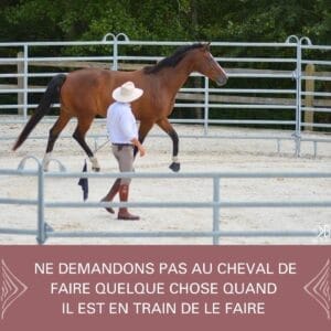 Tout comme dire ‘’non, non, non’’ ou ‘’ne fais pas ça’’. Ça ne dit pas au cheval quoi faire, tout ce qu’il comprend c’est que dans notre intonation nous ne sommes pas contents. L’article ‘’SOYONS AMBASSADEURS DU ‘’OUI’’ avec nos chevaux ‘’de la série RESPONSABILISER SON CHEVAL explique bien ce concept.