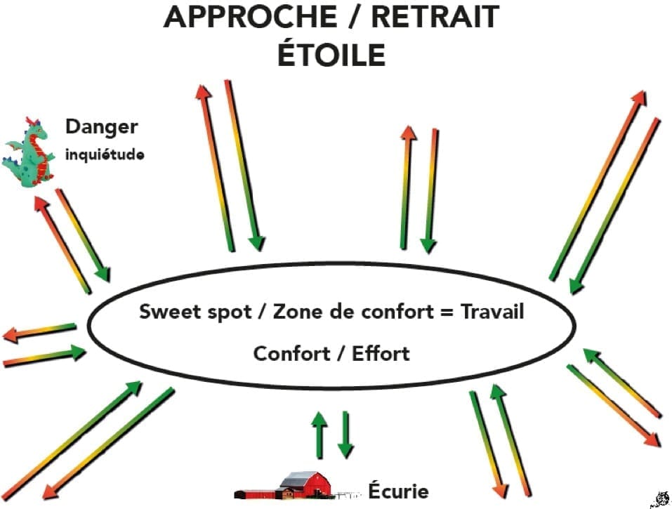 Tout comme les cercles on commence loin et par de longs triangles pour graduellement les rapprocher et les aplatir afin de passer le plus de temps possible proche de la zone perçue par le cheval comme inquiétante.