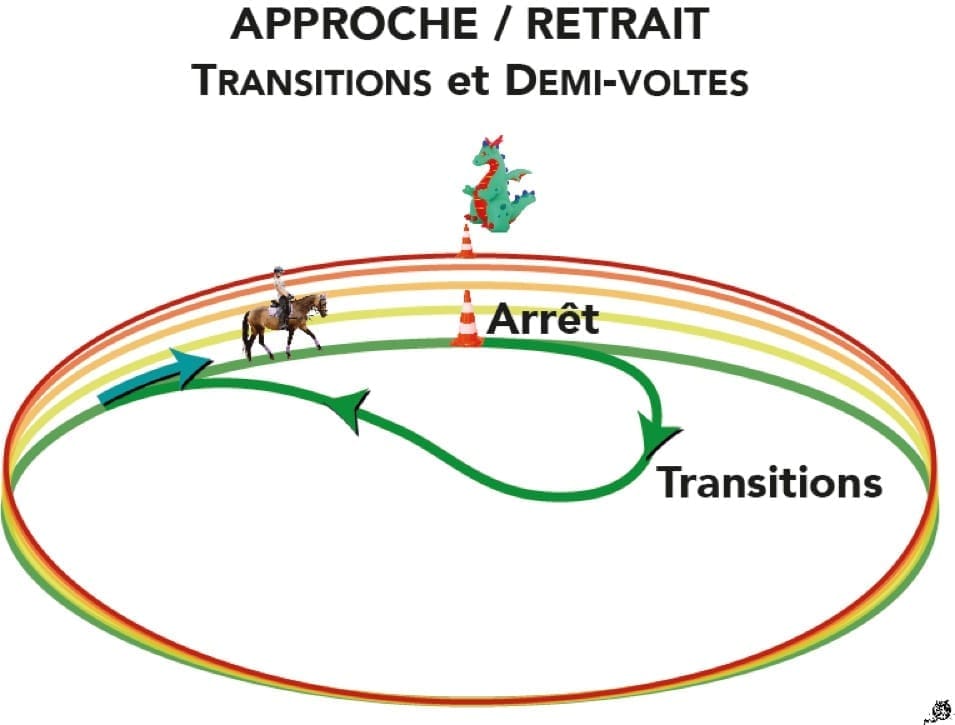 Quand le patron est réussi avec un cheval calme lors des transitions pas/trot avec arrêts au cône dans les deux sens il est temps d’approcher le cône plus près de la zone d’inconfort.