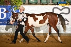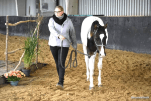 Lyne vous démontre avec une jeune pouliche de 2 ans la serpentine ou slalom. La pouliche ne l’a jamais fait donc vous allez pouvoir voir comment elle l’amène à suivre ses épaules.