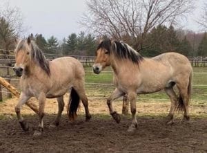 2- Deux fjords norvégiens sauvages adoptés par ma proprio d’écurie. Au paddock ils sont en synchronisme tout le temps.