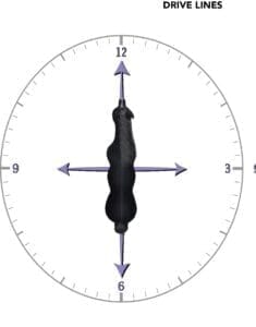 On voit sur le schéma que si l’humain déplace sa “drive line’’ (ligne directrice) longitudinale (12-6 hres) que ça déplace aussi celle du cheval. Il en est de même si le leader ouvre sa “drive line’’ dans la direction opposée au cheval, celui-ci est attiré vers l’humain.