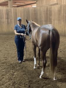 Puis en m’amusant avec ce concept je me suis dit que puisque Indy imitait la position de mon corps si je me penchais vers l’avant de façon prononcée, elle devrait m’imiter et baisser son encolure. Et oui! Une réussite. Certes que je ne suis pas élégante à regarder mais c’est certes mieux qu’enrêner notre cheval pour atteindre ce but. J’ai appris à utiliser la chambrière dirigée sous l’abdomen du cheval pour lui demander de le soulever et c’est là que m’est venue cette idée.