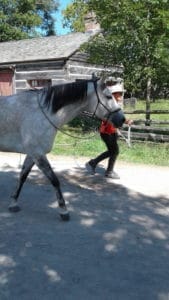 Photo : Indy, en liberté à mes côtés dans le village lors du Horse Lovers weekend à Upper Canada Village où il y a plus de 3,000 visiteurs par jour. Elle est en synchronisme avec moi. Elle a un licol mais la courte longe est sur son dos.