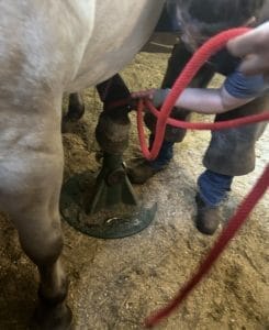 Il a bien fallu faire tailler leurs sabots car avec la vie au box pendant quelques mois, le temps de pouvoir leur toucher, mettre un licol et leur enseigner les bases de cession à la pression afin de ne pas se faire bousculer lorsqu’on les manipulait, les sabots sont devenus très longs. A trois on y est parvenu assez bien. La pareuse faisait son travail, la proprio a dirigé la pied avec la corde rouge sur le trépied et moi j’étais à la tête du cheval. Nous deux avons pratiqué des respirations profondes et lentes et beaucoup de ‘’lick and chew’’ et ils répondaient bien à ça. Ouf!