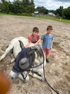 Récemment j’ai eu la visite de ma filleule avec ses 2 garçons. La famille est revenue à Montréal après une quinzaine d’années en Europe dont 12 ans à Londres. Les enfants ont brossé Indy au box puis nous sommes allés dehors et ils se sont assis sur elle pour un peu de pas et de trot. Puis j’ai enlevé la selle et leur ai expliqué qu’elle nous imiterait si on se pliait les genoux elle ferait de même. Les garçons ont dit ‘’elle va donc se coucher?’’ eh! oui. Indy a bien répondu : c’est du mimétisme. Il faut évidemment que le cheval soit dans une zone de confort et pas inquiet.