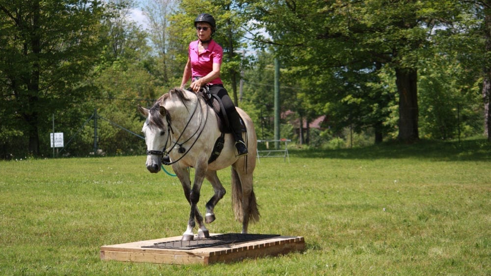 “Plus notre cheval sera calme et détendu, plus la zone de confort sera grande; il coopérera à nos demandes dans des endroits qui pourraient à prime abord, sembler être inquiétants, tels les exemples cités ci-dessous : la traverse d’un pont au-dessus d’une rivière assez tumultueuse et l’embarquement dans la remorque”.