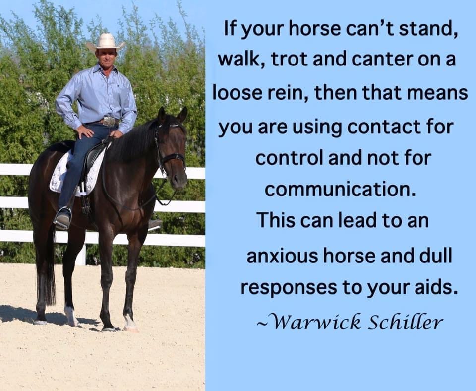 “Si votre cheval ne peut rester à l’arrêt, marcher, trotter et galoper en rênes détendues, cela veut dire que vous utiliser les rênes pour contrôler et non communiquer. Ce qui nous amène vers un cheval anxieux ou insensible à vos aides”.