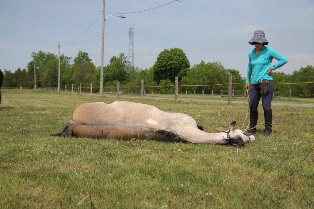 Si on demande à notre cheval de se coucher, surtout ne pas utiliser des cordes, ni prendre ses pattes. Il doit se sentir en sécurité, être en confiance avec la personne qui demande, calme et s’il répond bien à la pression, parfois sur la nuque ou tout simplement vous imiter lorsque vous pliez les genoux.