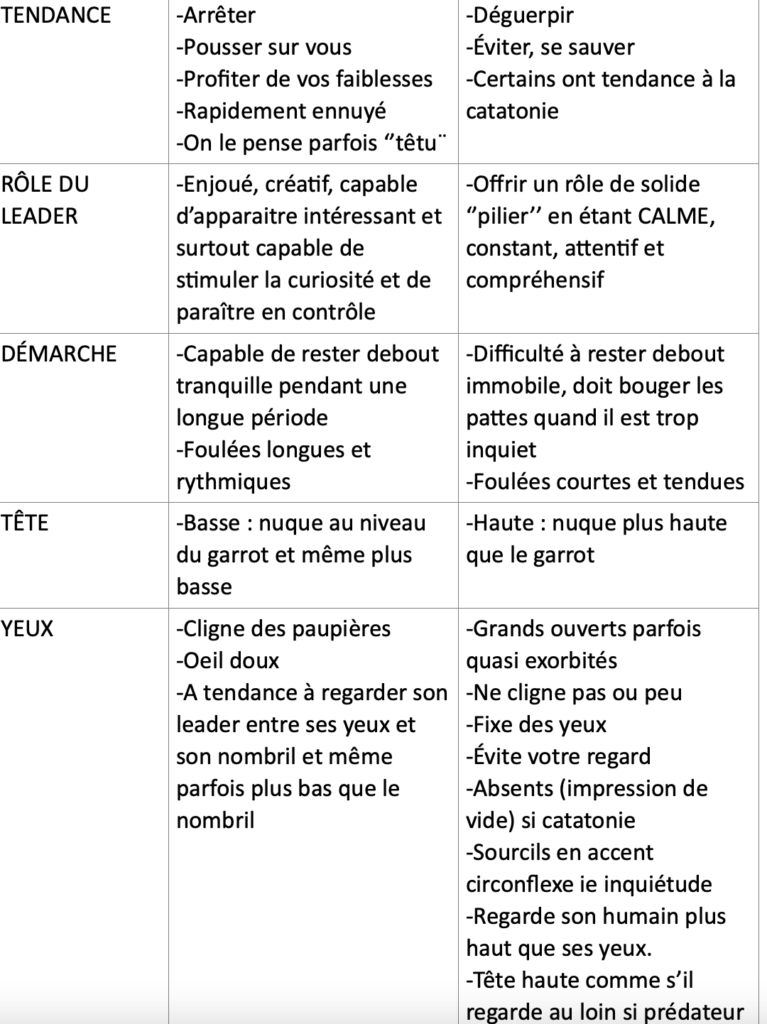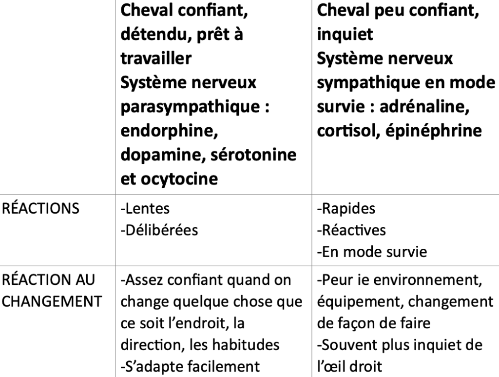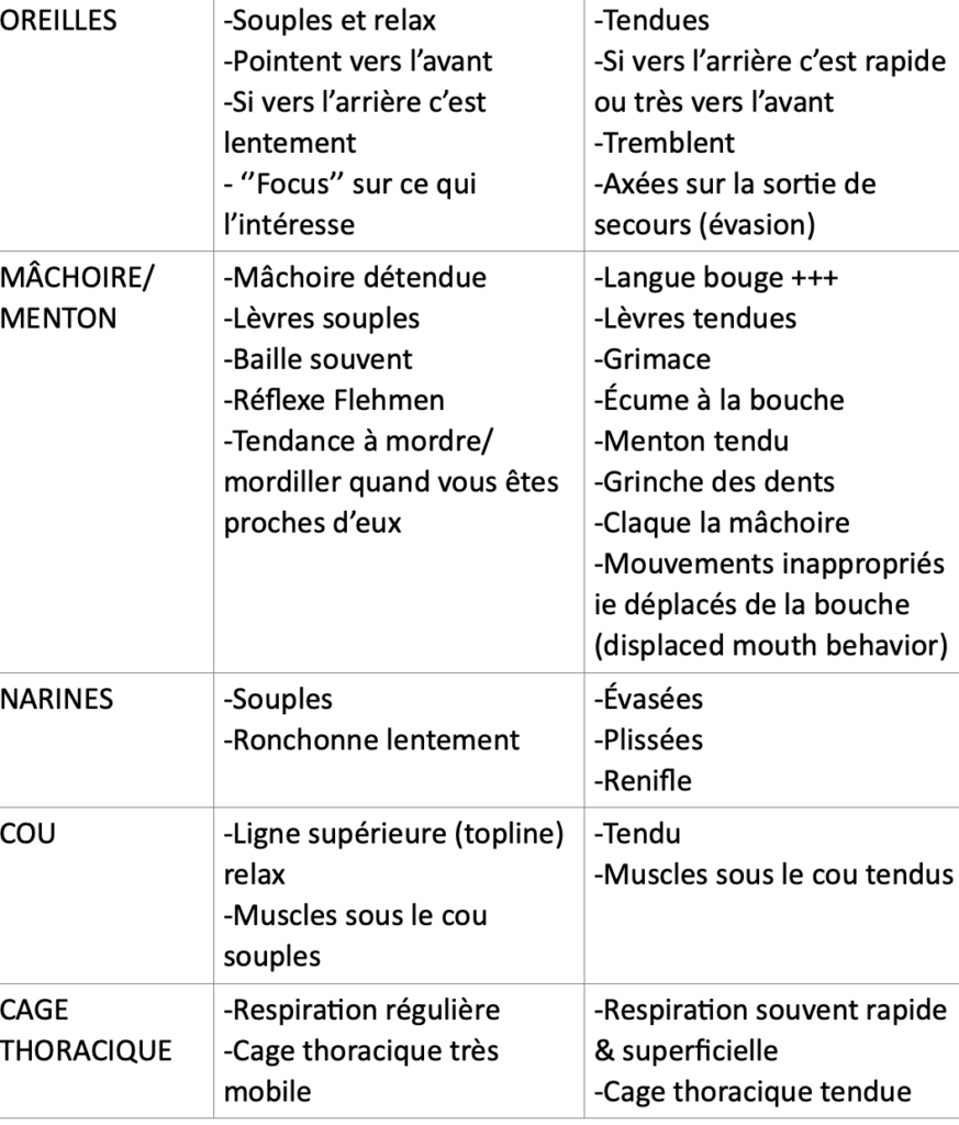 Le tableau ci-bas décrit des caractéristiques et comportements du cheval lorsqu’il est tendu versus lorsqu’il est relax. Il est important de réaliser que notre cheval peut valser entre ces deux scénarios selon les jours, les circonstances, les stimuli rencontrés.