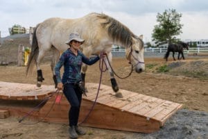 Une belle photo de ma jument Indy prise à Horseland, un parc équestre avec de multiples obstacles simples et parfois complexes. Lors de notre première clinique de Mountain Trail, Indy a démontré qu’elle avait bien maîtrisé le pont roulant avec moi au sol et que nous étions prêtes à le faire en selle. Même que suite à l’approbation de l’instructeur pour négocier l’obstacle en selle, je l’ai refait quelques fois à pied en envoyant Indy devant moi. Elle était donc la sentinelle et n’avait pas besoin de moi à ses côtés pour être confiante. Ainsi, suite à cet obstacle, nous avons continué à évoluer vers un prochain obstacle.Ma jument était très détendue et j’évitais ainsi d’accumuler d’éléments déclencheurs.