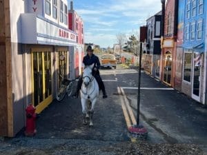 Ce village est une réplique de l’époque des années 1860 sans machinerie ni moteur. Le cheval est à l’honneur car il est l’ouvrier principal pour une multitude de travaux de la vie quotidienne. A tous les ans, il y a un festival pour éduquer le public sur les chevaux. Indy a été invitée 8 fois dont les 5 dernières fois comme leur ambassadrice d’équitation éthologique. Elle a obtenu l’unique privilège de se promener dans le village en liberté ou en selle sans bride.