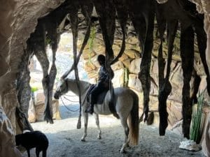 Plus nous mettons ce concept en pratique, plus notre cheval est confiant. L’an dernier Indy a été invitée à Horseland pour inaugurer les 4 nouveaux éléments qu’elle n’avait jamais vus : ville de New York, lac avec un immense crocodile, rivière Colorado puis la grotte. Nous nous sommes promenées, en selle, calmement dans chacun de ces éléments : Indy avait la tête basse, détendue tout en étant curieuse.