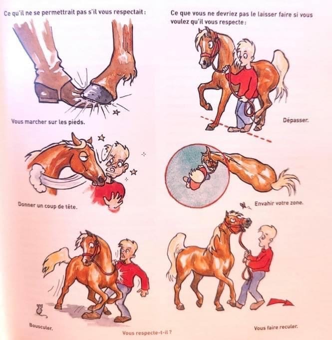 Dernièrement j’ai vu ce cartoon qui démontre des exemples de situations où les chevaux ne cèdent pas à la pression et où l’humain ne réclame pas son territoire. L’article 6 de cette section sur le PARTENARIAT décrit bien la technique de RÉCLAMER SON TERRITOIRE !