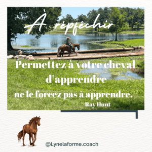 ‘’Laisser au cheval le temps de digérer mentalement l’exercice en le récompensant pour l’effort fourni, en lui donnant un relâchement complet suite à une bonne réponse’’. Lyne Laforme