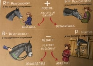 Ces dernières années avec les développements en éthologie équine on parle de moins en moins de renforcement punitif tel que démontré dans la photo ci-haut, section de droite. Frapper le cheval qui me mord ou priver mon cheval de son grain parce qu’il frappe dans la porte du box ne sont plus considérées comme de bonnes façons d’éduquer notre cheval car ce ne sont pas de bons modes d’apprentissage. Certes que si nous voulons bannir ces comportements il y a d’autres stratégies à utiliser que la punition.