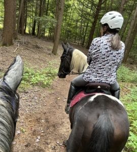 Denyse Rousselet, cavalière du Québec depuis 35 ans, a eu l’immense privilège depuis une douzaine d’années de voyager à la rencontre de nombreux horsemen/horsewomen fort reconnus pour leurs compétences en horsemanship tout en étant aussi réputés pour leurs performances exceptionnelles avec leurs chevaux. Plusieurs stages en France, Italie, Costa Rica, USA, Ontario et Colombie Britannique totalisant environ un an, lui ont inculqué des notions, concepts et stratégies pas fréquemment enseignés dans nos milieux équestres. Ce cheminement a amené Denyse à être reconnue par ses conférences et cliniques sur le développement d’un bon cheval de randonnée ainsi que des diverses stratégies afin de développer un cheval confiant, sécuritaire et bon partenaire.