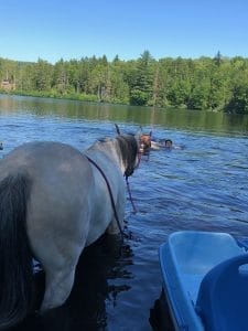 Prenons comme exemple la baignade. Pour certains chevaux ça peut exiger un effort considérable s’ils ne sont pas confortables dans l’eau. Il est important d’amener le cheval à y être à l’aise et de vouloir y aller et non le forcer à y aller.