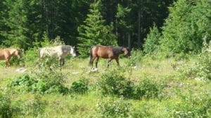 Lorsqu’un prédateur est présent et qu’il est en train d’évaluer ses chances, s’il évalue qu’elles sont minces, les chevaux surveillent mais ne sont pas en mode haute alerte. Plusieurs fois lors de mes randonnées et voyages avec Indy je l’ai vue s’arrêter, scruter au loin sans bouger afin d’évaluer la situation, puis continuer sa route ayant réalisé qu’elle n’était pas en danger et ce même les 3 fois où nous avons rencontré un ours…… Oui…un…. ours! Évidemment………… je n’ai pas de photos. Quand ce sont des chevreuils, orignaux, ratons laveurs, castors ou mouffettes, elle regarde sans inquiétude car ce ne sont pas des prédateurs pour les chevaux.. Elle est plutôt curieuse.