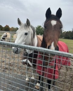 Un jour, j’ai réalisé que lorsqu’il ne semblait pas savoir pourquoi venir, Indy l’amenait à la porte de la clôture. Elle connaissait la routine. J’appelais Aramis puis allait préparer la chaudière de grain mouillé. Quelle ne fut pas ma surprise la première fois que j’ai vu les deux chevaux à la porte et que j’ai réalisé qu’Indy avait compris que Aramis devait entrer. Ils étaient TRÈS TRÈS LIÉS ces deux chevaux d’autant plus que nous avions perdu dans la dernière année leurs deux autres congénères. Non seulement Aramis était-il à la porte mais il était du côté où elle ouvrait. La journée où la photo a été prise Aramis était au fond de l’enclos dans l’abri. Indy était littéralement allée le chercher pour l’amener à la porte. J’en fus quelque peu estomaquée car je prévoyais être obligée d’aller le chercher au fond de l’enclos.