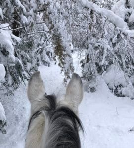 Une autre fois, elle a regardé la situation et décidé de contourner le tout par la droite. Sage décision. Certes que des cavaliers avaient passé avant que la branche plie sous le poids de la neige car on y voyait des traces mais c’était trop bas pour la cavalière. Elle avait encore une fois bien évalué la conjoncture. Intéressant dans ces cas car elle s’arrête et je la vois penser comment négocier la situation.