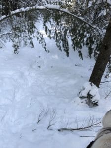 Puis l’hiver quand la neige tombe pesamment sur les arbres, notre chemin est parfois coupé par des branches enneigées, très basses. Je laisse à Indy la décision de traverser ou de faire un détour; je n’ai pas besoin d’intervenir. On s’arrête et je lui laisse le temps d’évaluer la situation. Ci-bas, elle a opté de passer à droite de la longue branche du milieu et nous avons très bien passé. Si vous observez bien, l’espace est plus large mais moins haut à gauche et Indy a bien évalué. Elle marche toujours lentement et même attend que je sois sortie des branches et débarrassée de la neige sur moi.