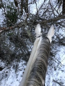 Parfois, le cheval doit vraiment chercher un chemin quand nous sommes les premiers à trouver un arbre tombé sur la piste.