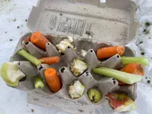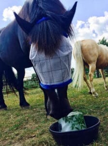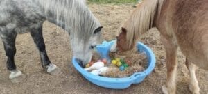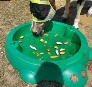 Les nutritionnistes de Madbarn en Ontario suggèrent de remplir un contenant d’eau et d’y mettre du foin, du gazon, des morceaux de pomme et de carottes. Gelez-le et puis mettez le dans un plus grand récipient dans le paddock. C’est une façon d’occuper son cheval, de ralentir sa consommation de nourriture tout en étant une stimulation sensorielle. Pas très pratique à moins d’avoir un gros congélateur mais intéressant. Ce qui est aussi intéressant c’est que les pommes vont flotter et les carottes calent donc il y a de la nourriture tout au long du processus de fonte.