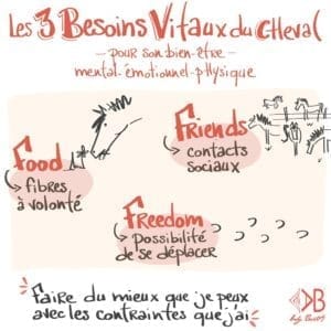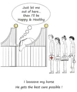 C’est de tenter d’améliorer le quotidien de notre cheval afin de répondre à leurs besoins de socialisation, de liberté, de mouvement et de broutage. Ceci afin d’éviter l’ennui et de réduire les comportements stéréotypés. Warwick Schiller nous le rappelle fréquemment, les chevaux ont besoin des 3 F : freedom, food and friends soit la liberté, les amis et le besoin de brouter plusieurs heures par jour. Andy Booth l’a bien traduit dans ce schéma.