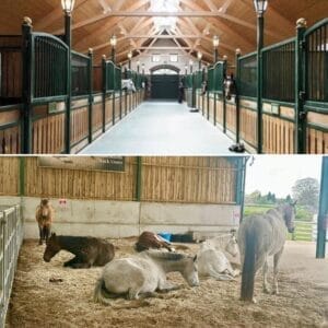 Depuis plusieurs années on parle d’un milieu de vie qui permet au cheval de vivre en troupeau et en liberté en minimisant les heures passées au box. Il faut penser que les conditions de vie de nos chevaux sont le résultat des besoins de l’humain et non du cheval : box, petits paddocks avec 1 seul cheval parfois 2 rarement 3 mais pas de groupes.