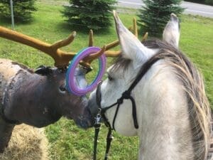 Indy curieuse quand elle a vu ce chevreuil en plastique lors d’une clinique. Elle qui a été élevée dans une immense vallée en C-B pendant 5 ans ne comprenait pas ce que c’était tant qu’elle ne s’est pas mis le nez dessus et réalisé qu’il était faux.