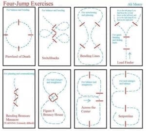 Photos : avec 4 pôles et 4 à 5 cônes on peut faire une variété d’exercices afin de rendre ça intéressant pour notre cheval.