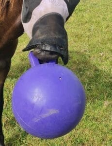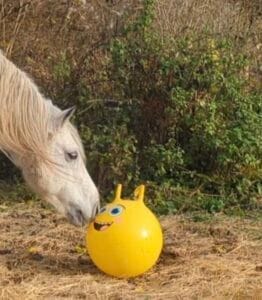 Donnons-lui des jouets pour stimuler la curiosité et le jeu chez les chevaux lorsqu’ils sont au paddock surtout si celui-ci est minuscule. Si on peut cacher des ‘’bonbons’’ dans les recoins du paddock, mettre des jouets ici et là ça stimule l’intérêt de notre cheval.