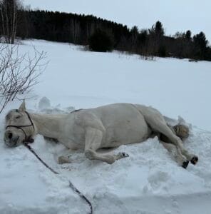 Les copines et moi allons souvent marcher dehors avec notre cheval été comme hiver. On jase, les chevaux broutent, mangent des aiguilles de pin et l’hiver ils grattent dans la neige pour trouver de l’herbe plus longue car dans nos paddocks, le gazon ne pousse jamais suffisamment pour allonger. Indy adore se rouler dans la neige et même cette fois elle a sommeillé à en ronfler.