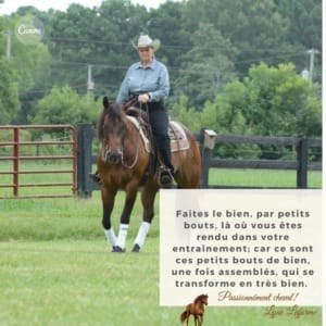 J’ai rencontré Lyne suite à une publication sur le concept du rectangle, technique où le leader donne la responsabilité à son cheval à demeurer dans son rectangle imaginaire. Certes que le leader peut replacer son cheval et lui donner le relâchement requis afin qu’il comprenne bien la demande mais il est aussi intéressant de donner plus de responsabilités à son cheval afin de l’impliquer encore plus dans notre partenariat. Il ne faut pas oublier qu’en équitation il y a souvent beaucoup de micro-gestion.