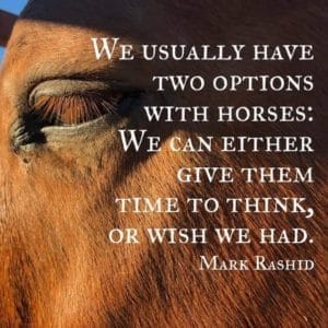 Le horseman américain très réputé Mark Rashid nous rappelle que nous avons habituellement deux choix : soit qu’on donne à notre cheval le temps de penser ou regrettons de ne pas l’avoir fait.