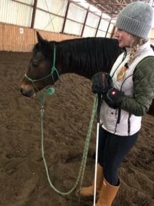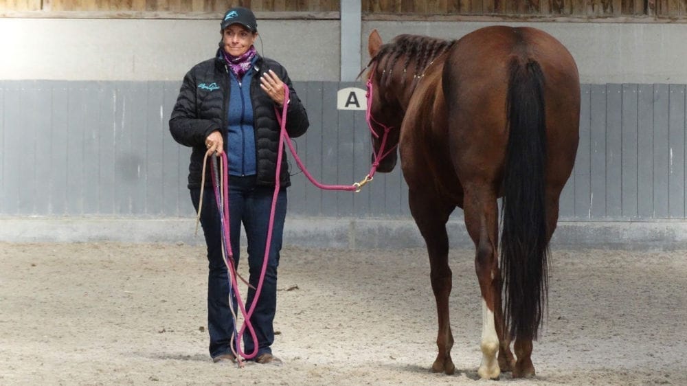 Fait intéressant, quelques semaines plus tard, la propriétaire m’a demandé de lui donner un coup de main pour aider la jument à ne plus la mordre et cela a eu un effet très positif. Certes que parfois elle devient frustrée et mord mais beaucoup moins qu’avant. La propriétaire a compris que si elle donne un message TRÈS CLAIR au cheval et qu’on lui laisse le temps de penser, d’absorber l’information, cela augmente les chances de succès.