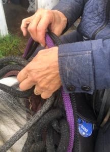 Je préfère une corde avec un nœud plutôt qu’un mousqueton pour l’attacher au licol car les mouvements de notre main se transmettent très bien. En plus, si le nœud frappe le menton du cheval c’est moins dur que le mousqueton de métal. Ainsi le cheval peut très bien sentir mes pressions les plus légères sur le licol et suivre les indications telles avancer, reculer, ralentir, accélérer, aller en avant ou en arrière (lorsque sur piste très étroite) et changer de côté etc.