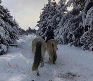 Personnellement, je n’amène JAMAIS un cheval en bât si personne ne m’accompagne en randonnée. C’est plus sécuritaire et respectueux pour les cavaliers que je rencontre qui sont parfois très mal à l’aise de me voir avec 3 chevaux même si j’ai mis les 2 chevaux à ma droite. La propriété est suffisamment grande pour qu’on s’y amuse en sécurité quand je suis seule.