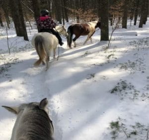 Si c’est un cheval sans expérience en randonnée ou un poulain ça lui fait explorer les environs avec un cheval maître et ça contribue à développer sa confiance.