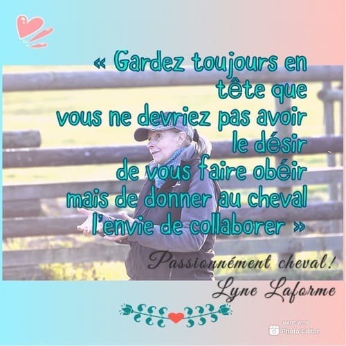 Un fait intéressant que j’ai noté c’est que beaucoup de gens ne sont pas prêts à y mettre l’effort. Quant au temps, je crois que ça n’en prend peut-être pas toujours plus mais au lieu de longer, longer et encore longer pendant des mois et des mois, peut-être qu’il y aurait autre chose à faire pour développer son cheval non seulement au niveau physique mais au niveau mental et émotif. Quand l’homme qui vient chercher l’immense tas de fumier accumulé assez près du manège avec son tracteur et son immense camion, pourquoi ne pas amener son cheval voir ça au lieu de dire “je ne peux pas monter aujourd’hui, le bruit du tracteur inquiète mon cheval’’. Mon humble opinion que je n’ose évidemment pas partager sauf auprès de copines qui ont vu la différence et qui travaillent dans ce sens. Comme on dit en anglais “think out of the box”, soit modifiez votre plan selon ce qui se passe autour, ceci afin de développer la confiance de votre cheval ;